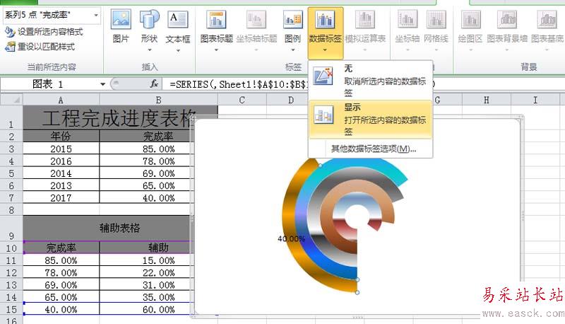 8、選擇一個圓環(huán),執(zhí)行布局-數(shù)據(jù)標(biāo)簽命令,從下拉菜單中選擇顯示,同樣方法依次把其他圓環(huán)的標(biāo)簽依次顯示出來。