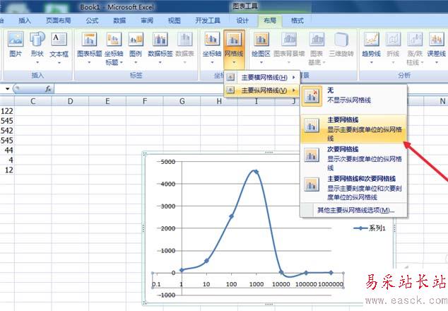 5、在【布局】中選擇網格線,選擇【主要縱坐標網格線】——【主要網格線】,當然也可以添加其他的橫(縱)坐標主(次)要網格線。