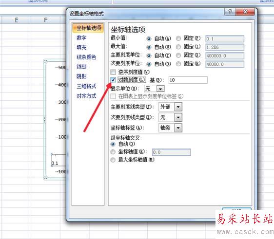 3、在彈出來的對話框中選擇【坐標軸選項】——【對數刻度】,在前面的方框中打鉤。然后【關閉】