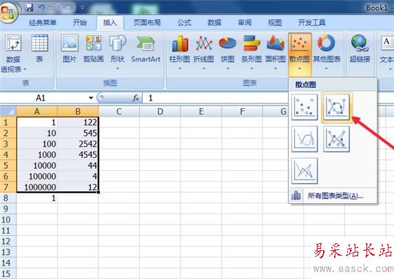 1、首先,我們先插入一個數據表格,選擇數據,然后點擊【插入】——【散點圖】