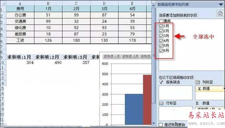 5、點(diǎn)選數(shù)據(jù)透視表區(qū)域,在右側(cè)的字段列表中選中所有月份。