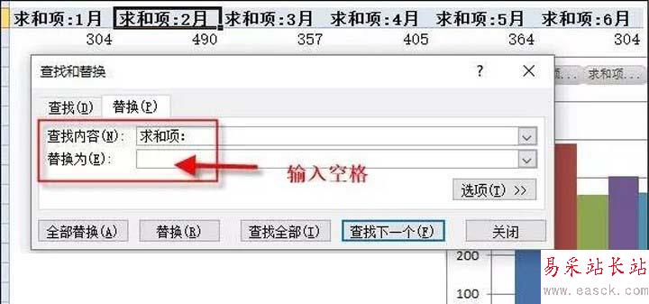 6、查找“求和項(xiàng):”,替換為 “  ”(空格)。把月份前多余的文字去掉。
