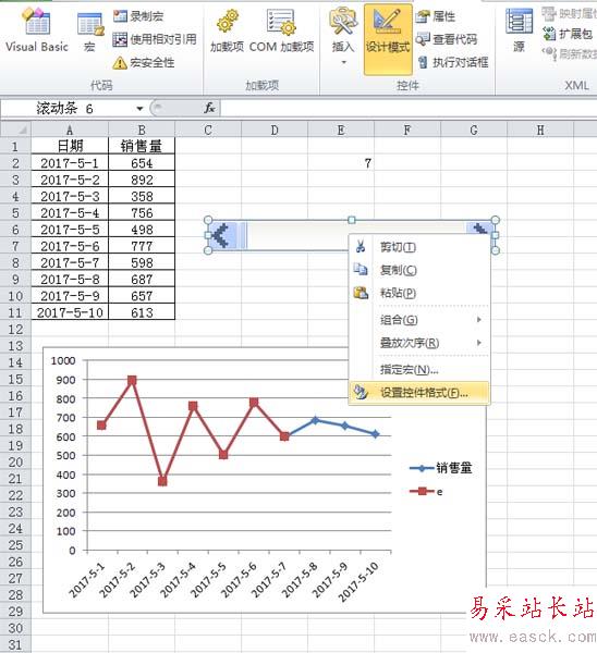 5、右鍵單擊該滾動條,從下拉菜單中選擇設置控件格式選項,接著彈出設置控件格式對話框。