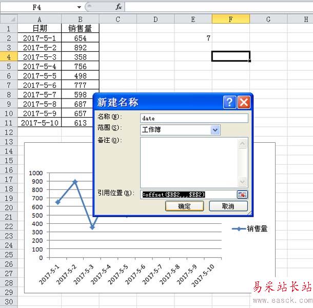 2、執行插入-折線圖命令,這樣就插入了一個折線圖,選擇單元格e2并輸入7,執行公式-定義名稱命令,在彈出的對話框中輸入名稱為date,引用位置設置為,點擊確定按鈕。