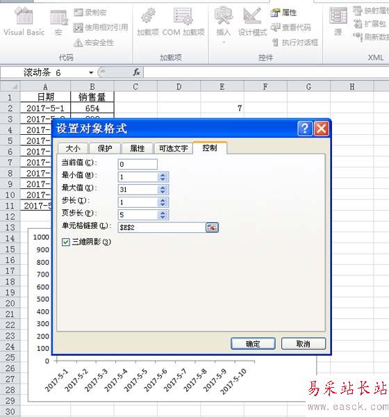6、在設置控件格式對話框中,切換到控制選項卡,設置最小值為1,最大值為31,頁步長為5,單元格鏈接為e2,點擊確定按鈕。