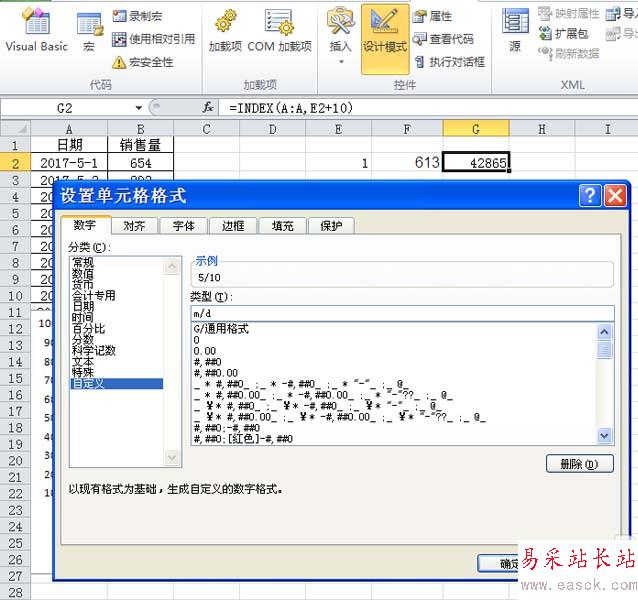 8、右鍵單擊單元格g2,從下拉菜單中選擇設置單元格格式選項,在彈出的對話框中設置自定義為 m/d.點擊確定按鈕。