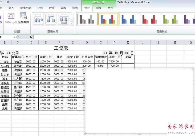1、現已有一個工資表格來作例子。圖一是已有工資表,圖二是目標操作。在這里,我們需要用B3:B15以及J3:J15區域的數據來制作圖表,也就是職工姓名以及職工的總工資,這兩組數據來放入圖表中。