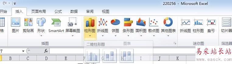 2、單擊一個空白單元格。單擊 插入-圖表 ,我們這里要求的是二維簇狀柱形圖,要認真看題目要求哦。一按下二維簇狀柱形圖 ,圖表就會出來了,但是我們會發現,圖表是空白的喔,因為需要我們自行選擇數據。