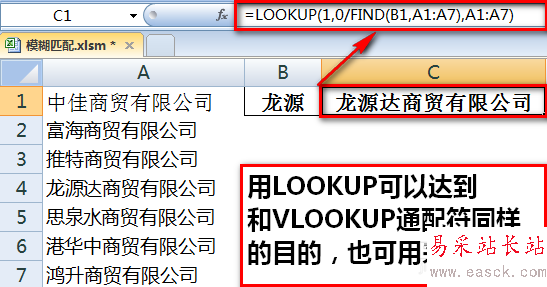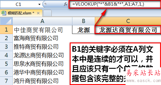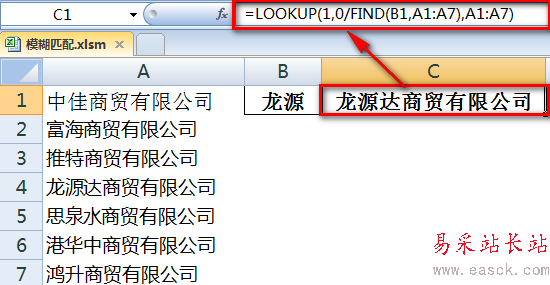 2、雙擊C1單元格,輸入公式=VLOOKUP("*"&B1&"*",A1:A7,1,),回車后C1單元格就返回了B1對應的A列公司全稱。