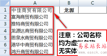 1、首先看一下原始數據,A列是一些公司全名,在B1處輸入一個簡稱或者說關鍵字(必須是在A列某個文本中連續包含的關鍵字),要在C1返回A列對應的全稱。