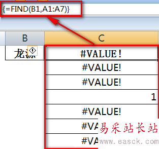 5、我們來看一下LOOKUP運算過程。首先FIND(B1,A1:A7)表示在A1:A7內查找B1內容,如果查找不到則返回錯誤值,如果查到返回在文本中的位置。