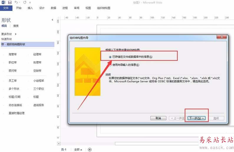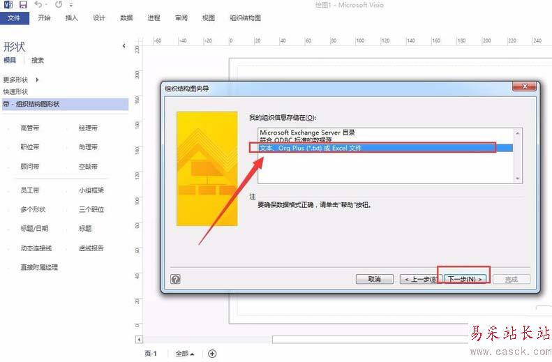5、我的組織信息存儲在中選擇”文本、Org Plus(*.txt)或Excel文件“,之后點擊”下一步“。