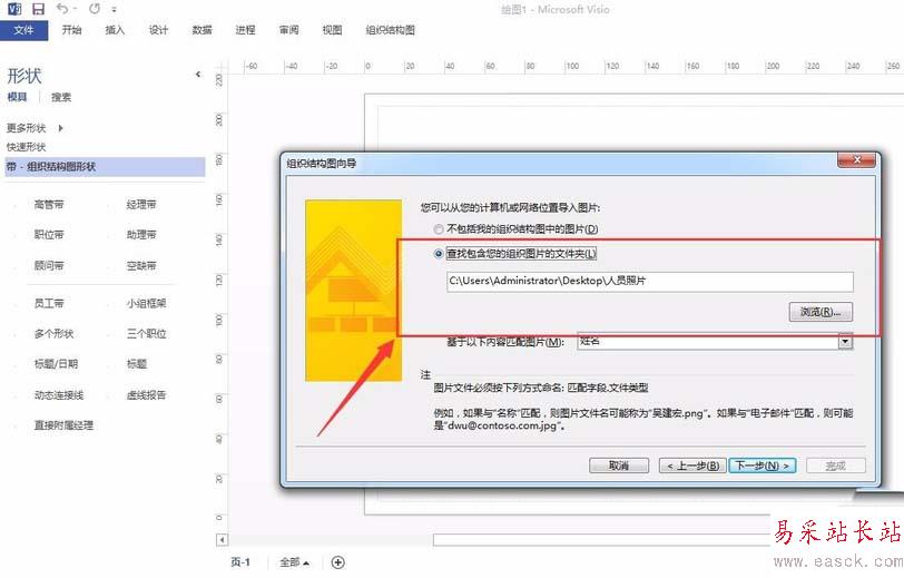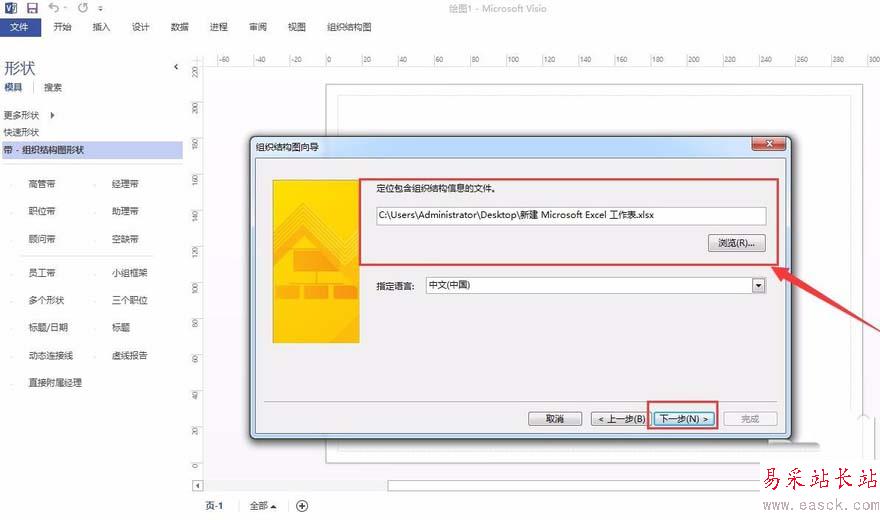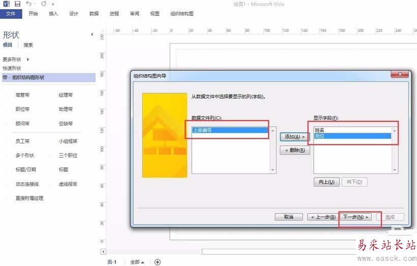 8、數據文件列選擇”上級編號“,顯示字段設置為”姓名“,形狀數據字段設置為”崗位“,點擊”下一步“。