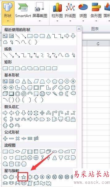 4、點擊形狀選項在星與旗幟選項中找到五角星形選項,如圖所示: