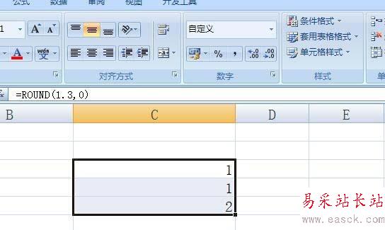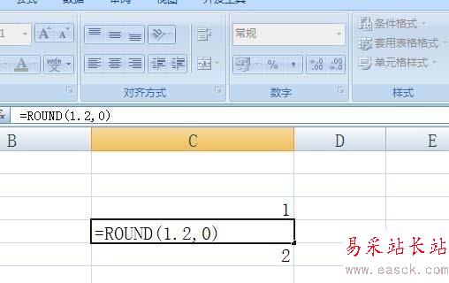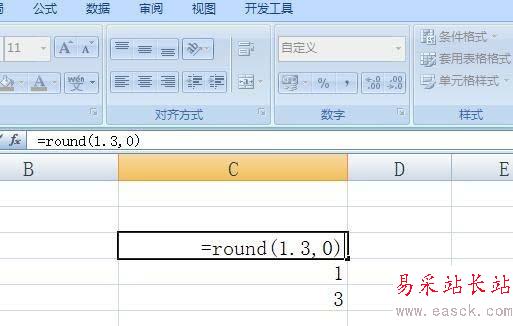 3、這時需要用到公式round,把上面兩個數字分別放于round函數中去舍掉小數位。如圖“=round(1.3,0)“,“=round(1.2,0)“。