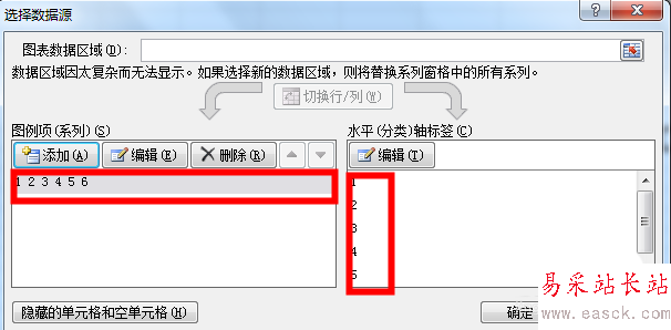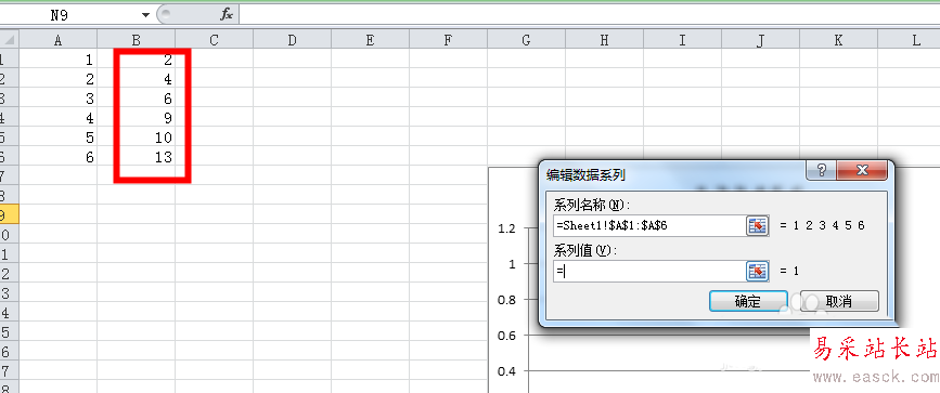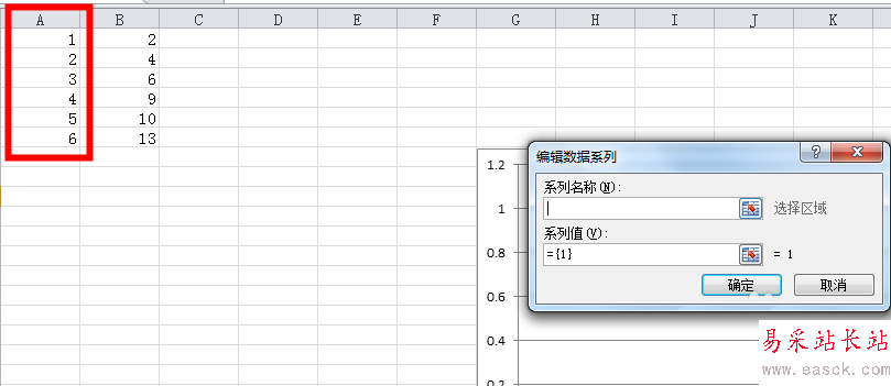 4、系列名稱是X軸,也就是小編這里的A列,系列值是Y軸,也就是小編這里的B列