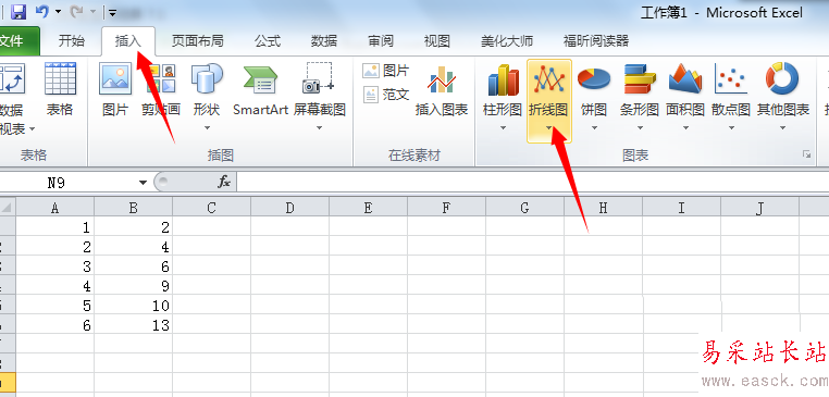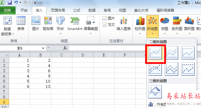 2、點擊“插入”,找到“折線圖”,選擇第一項,折線圖