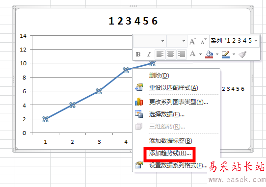 5、點擊確定即可出現曲線圖,右擊曲線圖,點擊添加趨勢線,在彈出的對話框中選擇線性和顯示公式,點擊確定