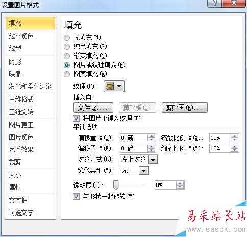 3、選擇--圖片與紋理填充。勾選--將圖片平鋪為紋理,就可以使用紋理填充。