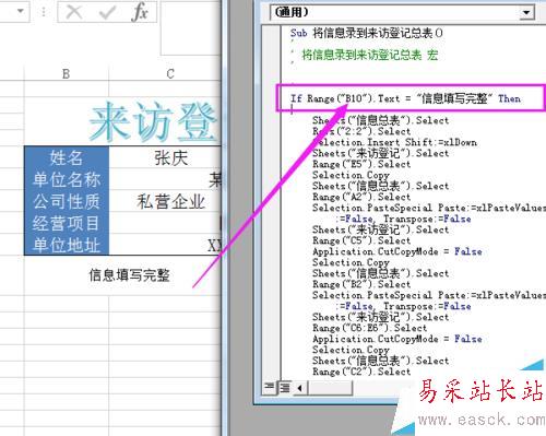 11、在開頭,輸入如下語句:If Range("B10").Text = "信息填寫完整" Then