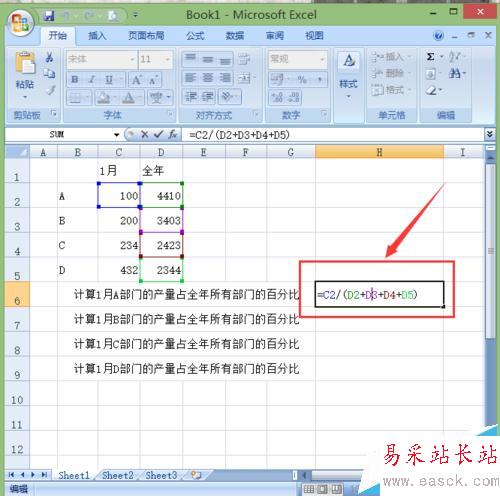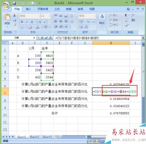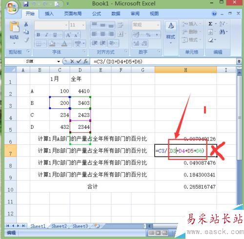 2、在計算百分比的第一個框中,輸入“=C2/(D2+D3+D4+D5),點擊”enter"鍵完成,計算出相應的百分比。