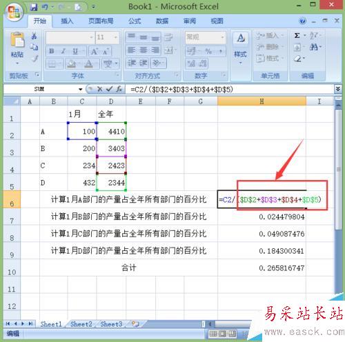 4、原因其實因為我們下拉時公式出現錯誤。點擊第二個公式框,我們會發現,公式框下拉后為“=C2/(D3+D4+D5+D6)",其實D6是沒有內容的,我們設想的是分母(D2+D3+D4+D5)是一直保持不變的,但是在下拉的過程中,這部分就自動發生了變化,那么如何才能把分母在每個公式中都固定保持不變呢?