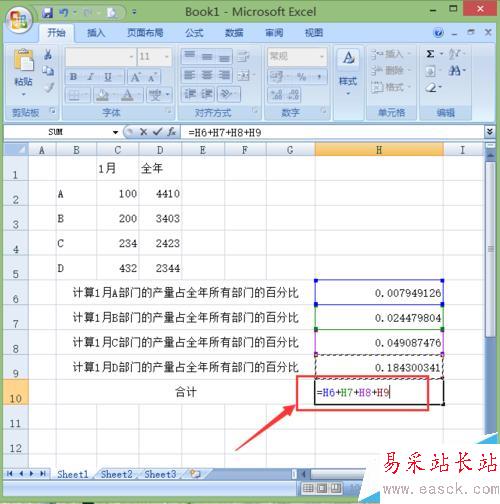 1、打開excel,輸入內容。這里舉例,計算各部門一月產量占全年全部部門的百分比情況。
