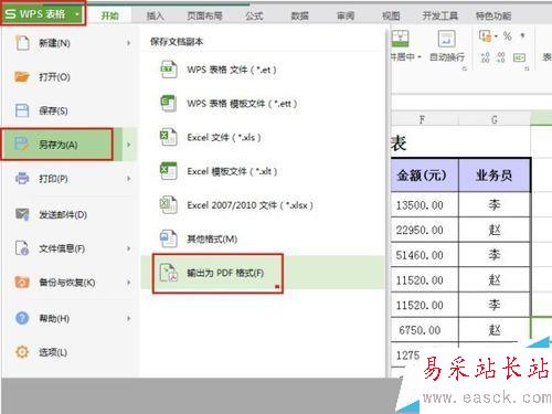 2、進入Excel表格后點擊“WPS表格”在點擊“另存為”在選擇“輸出為PDF格式”,如圖所示