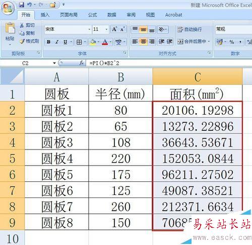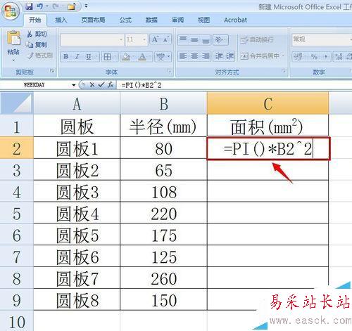 2、在C2單元格中輸入公式“=PI()*B2^2”,下面,分步介紹這個(gè)公式的含義。