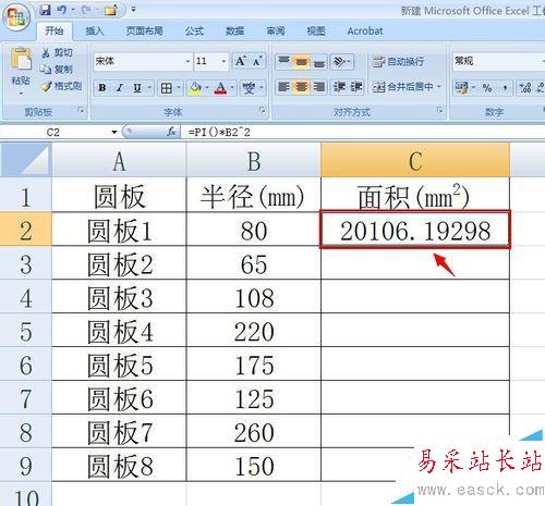 5、輸入公式后,按enter鍵,即得出一個(gè)圓的面積。