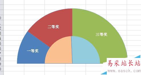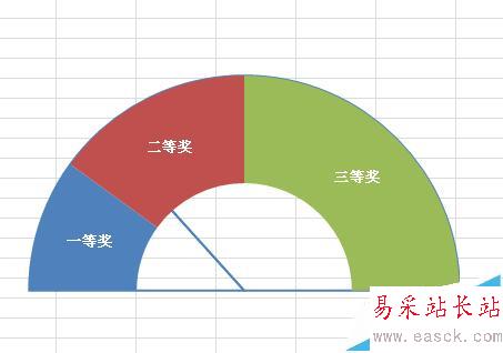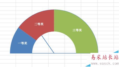 1、此圖的制作思路是將餅圖和環形圖的下半部隱藏掉,只保留上部半圓,所以數據點的比例關系只針對剩下的50%,如此例中三等獎中獎機率為50%,二等獎30%,一等獎20%,在做圖時換實際占比就是25%,15%和10%,下半部圓占比50%。以此四個數據點做數據表如下。