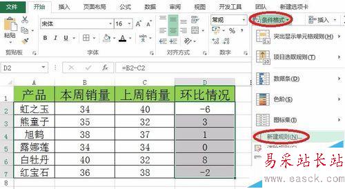3、選擇要設置條件格式的區域D2:D7,工具欄開始-條件格式-新建規則。