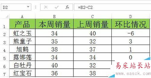 2、先來解決環比數據是如何來的,雖然很多同學都明白,還是啰嗦一下吧。在D2輸入公式“=B2-C2”,填充至D7。