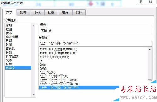 7、打開設置單元格格式對話框,選擇自定義格式,設置類型為“"上升 "0;"下降 "0;持平;”,當大于0時顯示上升+數值,小于0顯示下降+數值,等于0則顯示持平,除自定義格式外,也可以通過TEXT函數實現,區別就在于自定義不修改實際數值,不影響后續統計。