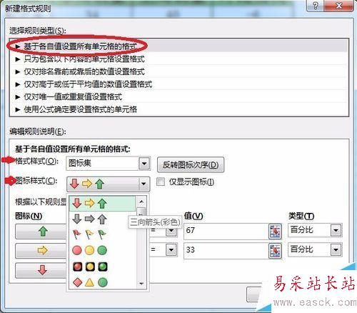 4、在彈出的新建規則對話框中,選擇規則類型為“基于各自值設置所有單元格的格式”,格式樣式下拉列表選擇“圖標集”,圖標樣式選擇“三向箭頭”。