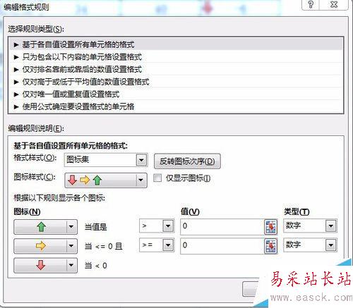 5、修改圖標的條件值,當大于0時,顯示向上箭頭,等于0時,顯示向右箭頭,小于0時,顯示向下箭頭。
