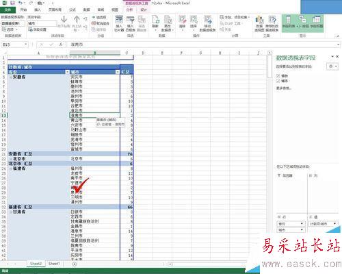 6、單擊確定后,即可看到數據透視表的顯示轉為經典顯示,省份與城市是對應的,而不是錯落的,如下圖所示: