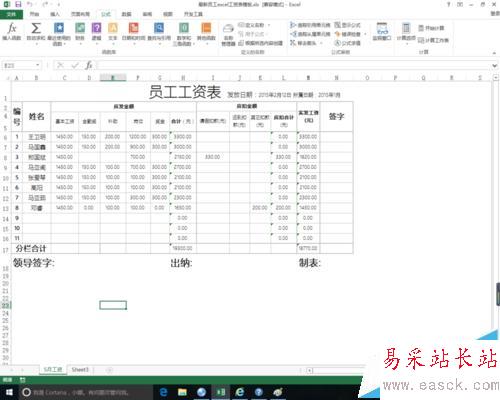 1、首先我們打開一個工作樣表作為例子。工作樣表為標準的工資表。