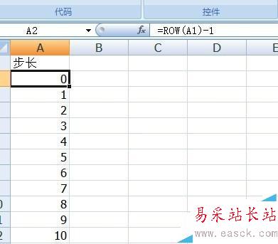 7、在“A1”單元格輸入“步長”,在“A2”單元格輸入公式“=ROW(A1)-1”,選中“A2”單元格,當(dāng)指針變成黑色十字時,往下拖至“A202”.