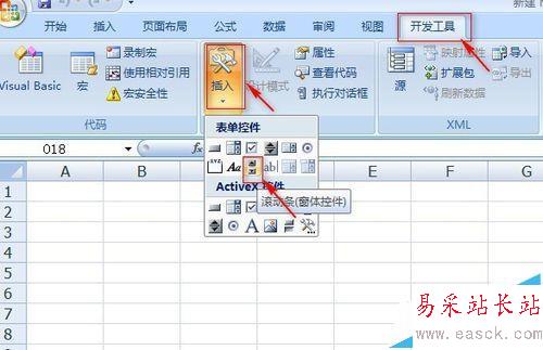 4、單擊菜單欄中“開發(fā)工具”選項卡,在“控件”組中單擊“插入”,再單擊“表單控制”下的“滾動條”。這是屏幕上會出現(xiàn)一個十字標(biāo)記,移動鼠標(biāo)把十字標(biāo)記放到合適的地方,單擊鼠標(biāo)左鍵,就會出現(xiàn)滾動條。