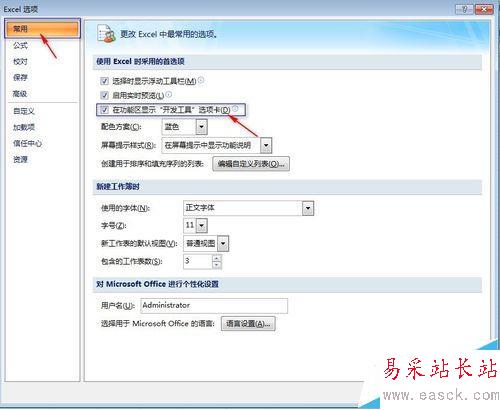 3、在彈出的“Excel選項”屬性框中,選擇“常用”,在“使用Excel時采用的首選項模塊下,選擇在“在功能區(qū)顯示開發(fā)工具選項卡”復(fù)選框打鉤,按確定。