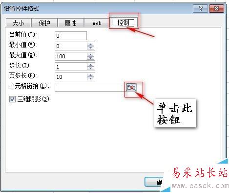 6、選中“滾動條”, 點擊鼠標(biāo)右鍵,在彈出的菜單中選擇“設(shè)置控件格式”。然后在設(shè)置控件格式屬性框中點擊“控制”,單擊“單元格鏈接”右側(cè)的按鈕,選擇“L1”單元格,按回車鍵返回,然后點擊“確定”。當(dāng)我們點擊“滾動條”的箭頭是,就看到“L1”單元格的數(shù)字發(fā)生變化了。