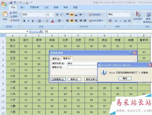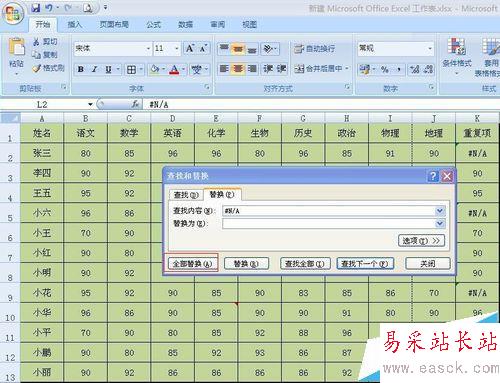 4、單擊“全部替換”之后會(huì)彈出如圖對(duì)話框,這時(shí)會(huì)提示我們已經(jīng)把有錯(cuò)誤符號(hào)的單元格都替換為空白了。