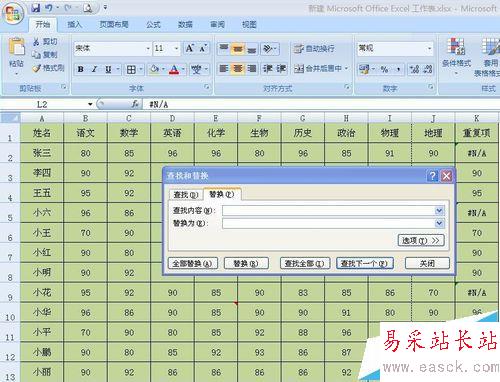 3、單擊“替換”按鈕之后會(huì)彈出如圖對(duì)話框,這時(shí)我們?cè)?ldquo;查找內(nèi)容”后面的輸入框里面黏貼錯(cuò)誤符號(hào)#N/A,如果你是想把錯(cuò)誤符號(hào)改成空白的話,那么就直接單擊下方的“全部替換”按鈕即可。如果想把錯(cuò)誤符號(hào)改為0就在“替換為”后面的輸入框里面輸入0即可。