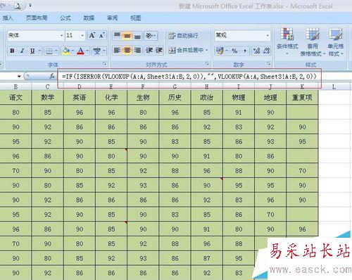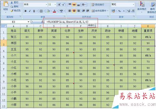 5、如果是輸入公式造成的錯(cuò)誤符號(hào)的話,我們只需要修改下我們的公式就可以啦。如圖,這個(gè)工作表我們所使用的是vlookup函數(shù)公式,原公式是:=VLOOKUP(A:A,Sheet3!A:B,2,0)。