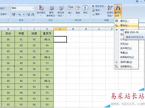 2、那么我們先復(fù)制錯(cuò)誤符號(hào),復(fù)制之后單擊菜單欄里的“開(kāi)始”按鈕,在最右側(cè)我們可以看到有一個(gè)“查找和選擇”選項(xiàng),單擊該按鈕會(huì)下拉選項(xiàng),在下拉的選項(xiàng)里我們單擊“替換”。