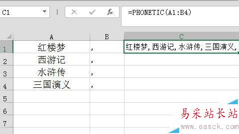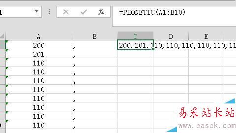 8、輸入公式:=PHONETIC(A1:B10)