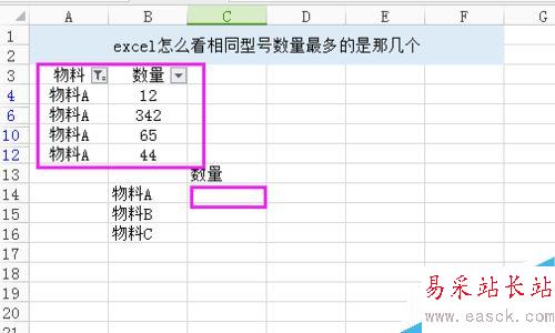 1、本文以物料A、B、C為例,以不同物料的不同數量以及多種重復性為數據依據,如下圖的顯示情況,進行excel選擇相同型號數量最多物料。