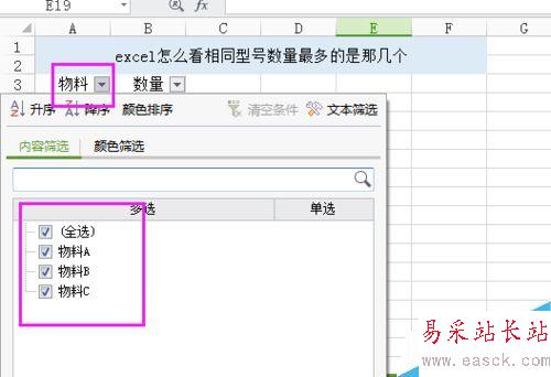 4、點選擇第一個物料類的數據小箭頭,可以看到有“全選”“物料A”“物料B”“物料C”,這里的數據主要是包含這一列的所有物料。如下圖顯示情況