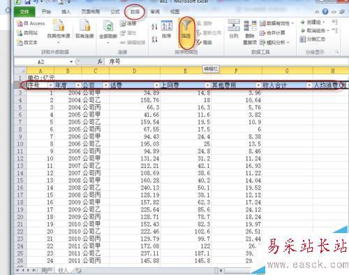 2、選定標題行,點菜單“數據”、“篩選”;例,如圖